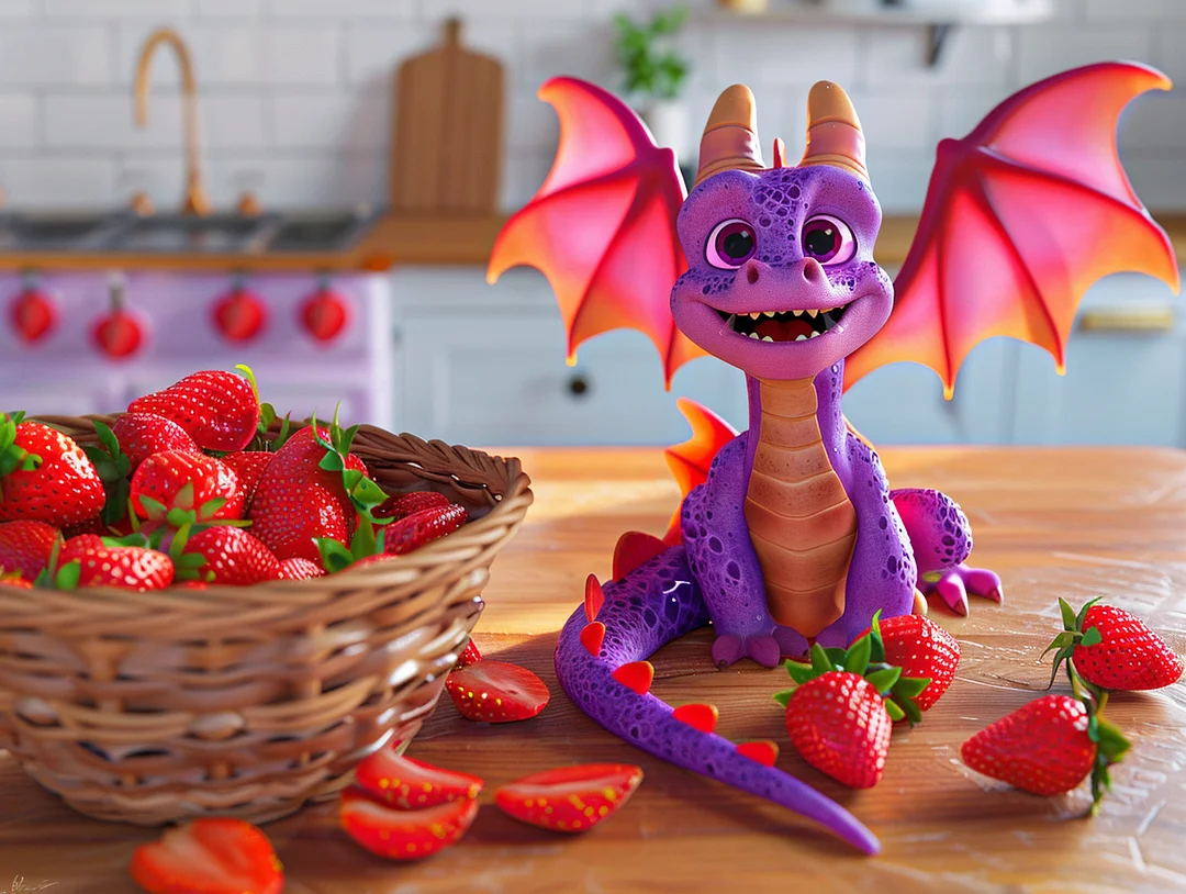 Little purple dragon stealing strawberries in the kitchen Full Drill with AB Detail Highlights- Full round/Square Drill Diamond Painting(velvet cloth)